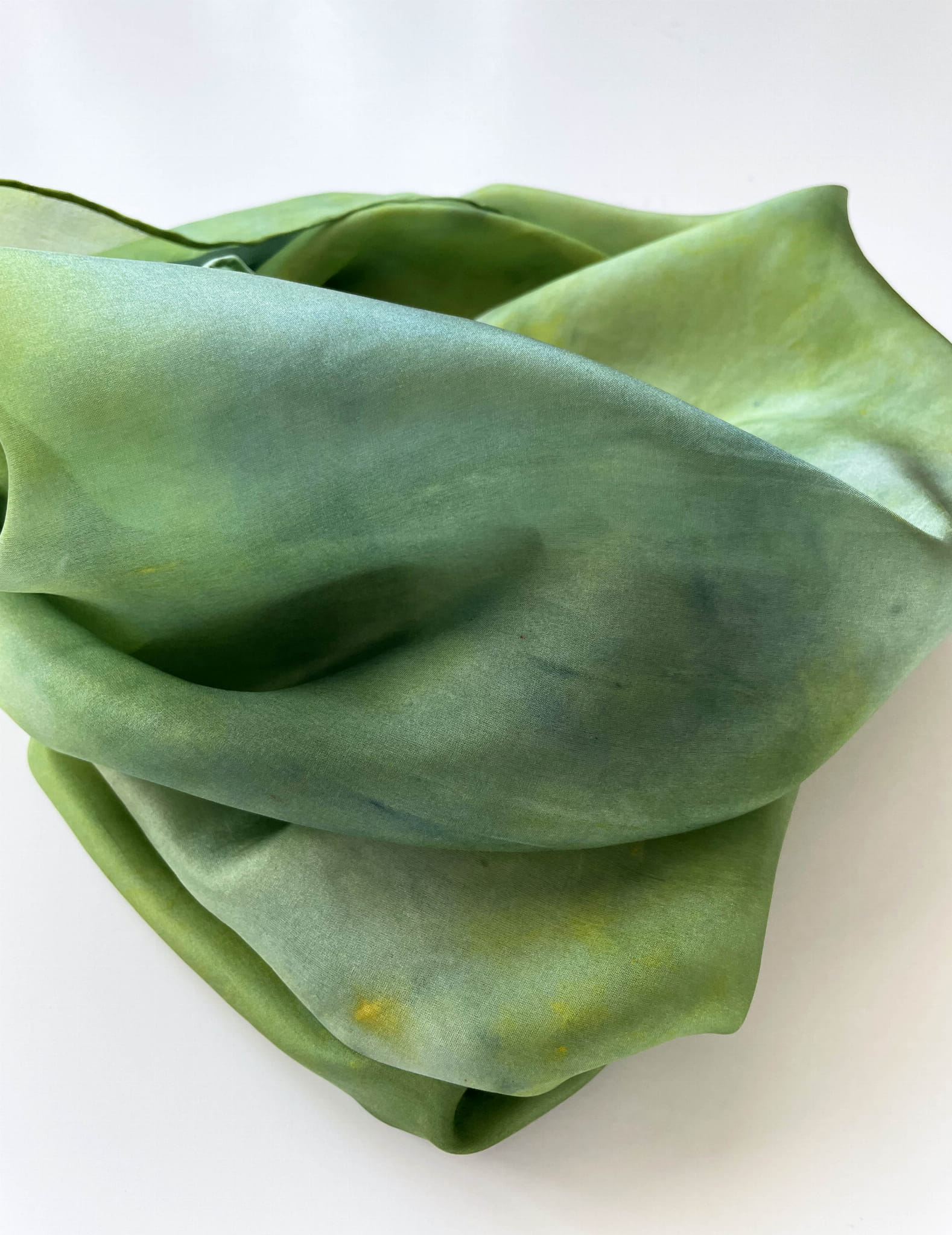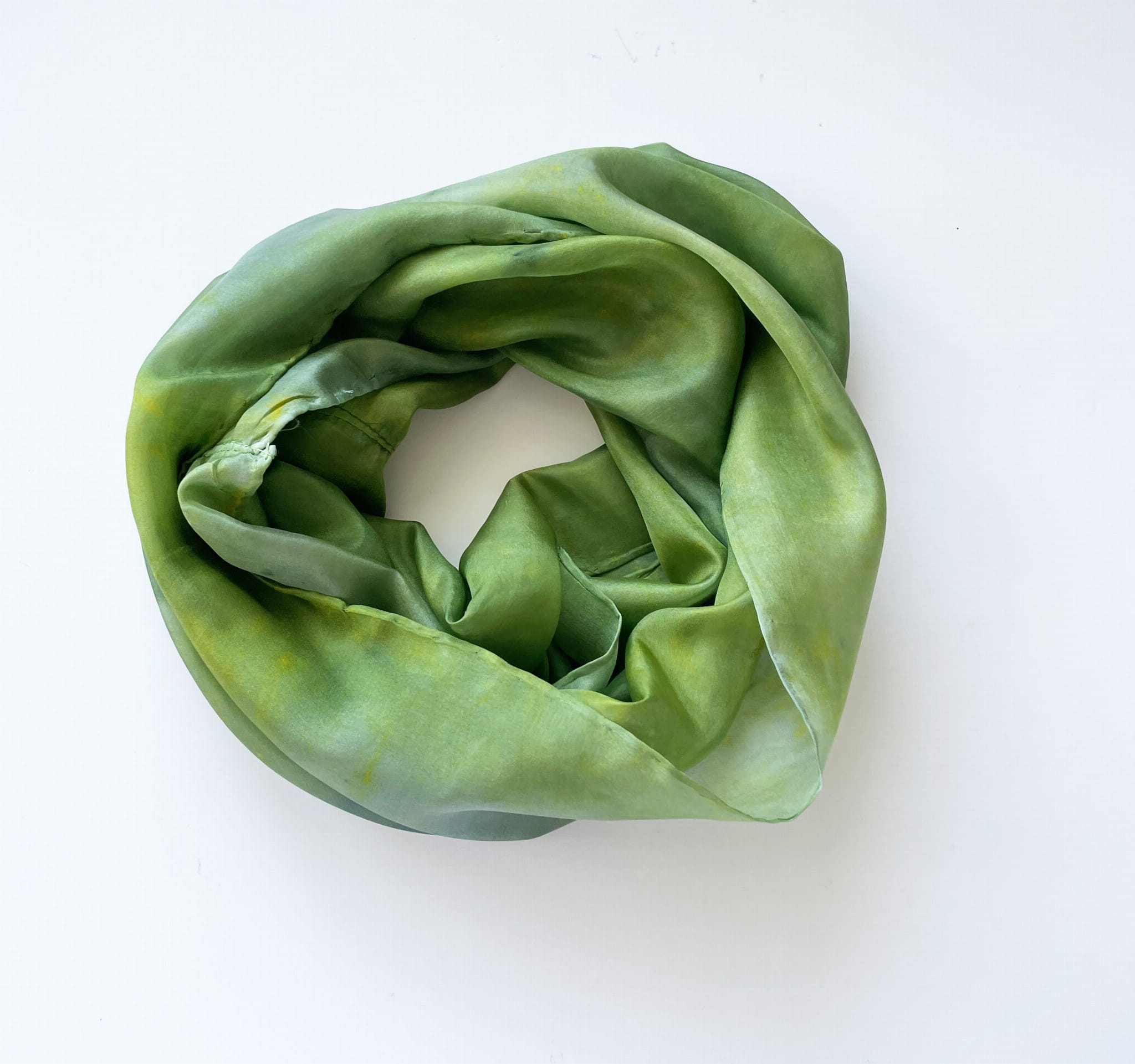 Delikatny, ręcznie malowany, jedwabny szal w formie komina o abstrakcyjnym wzorze. Komin rozmalowany jest w odcieniach jasnej oliwki.Obwód komina to 135 cm a szerokość 35cm co pozwala zamotać podwójnie szal wokół szyi. Szal uszyty jest ze 100% białego jedwabiu a jego brzeg jest ręcznie podszywany jedwabnymi nićmi, dzięki czemu jest niezwykle delikatny, lekki i ładnie układający się na szyi.