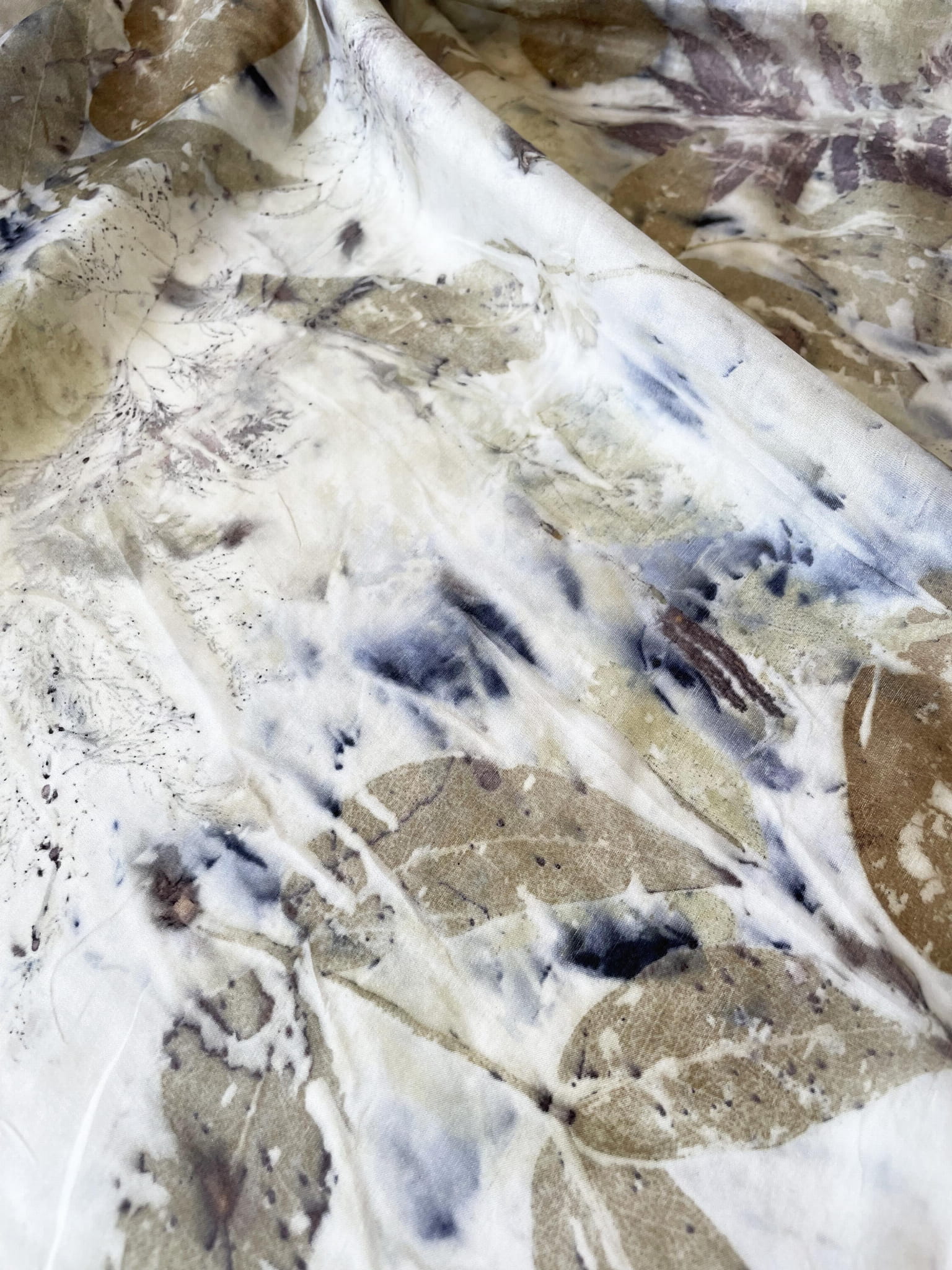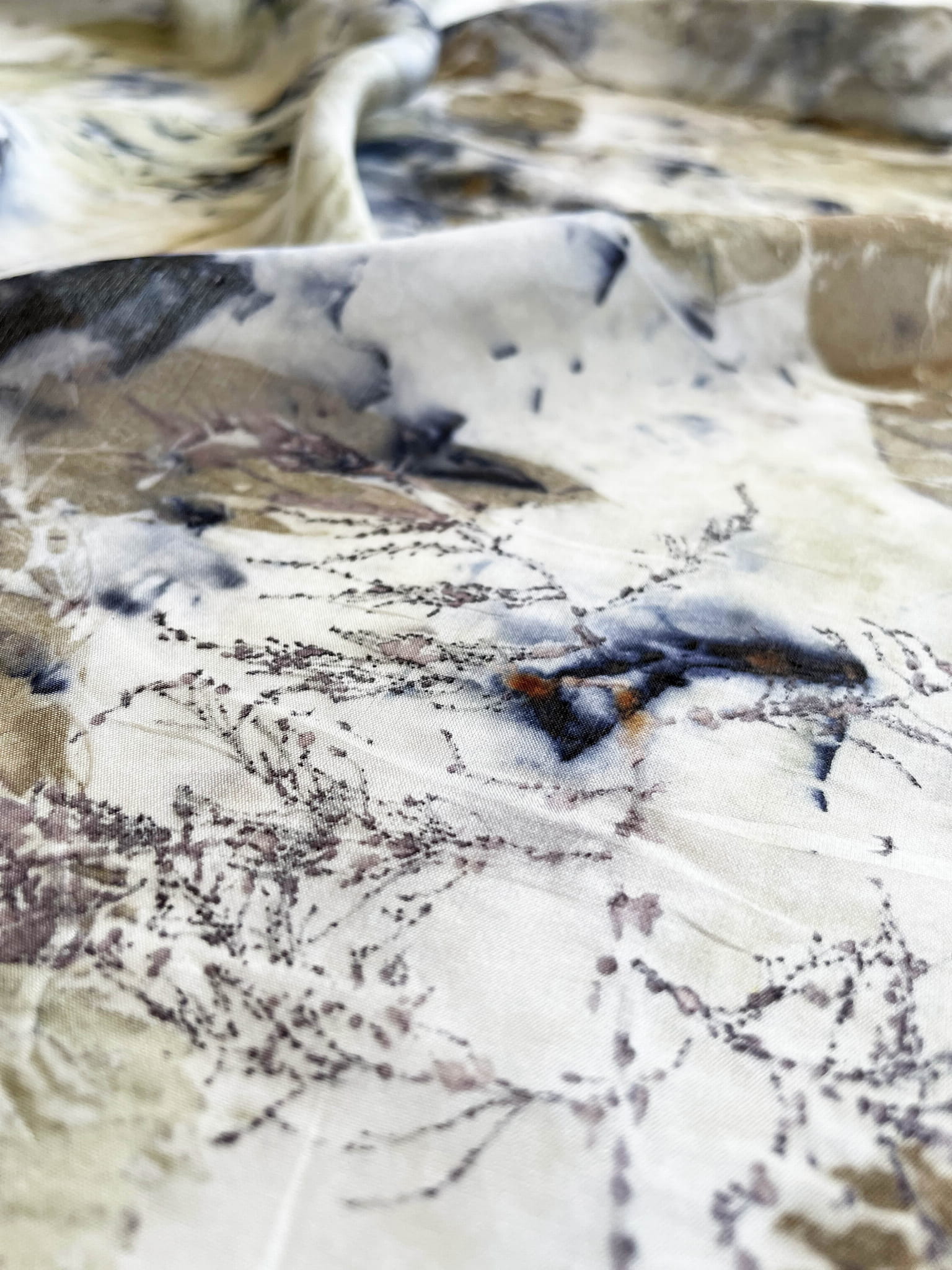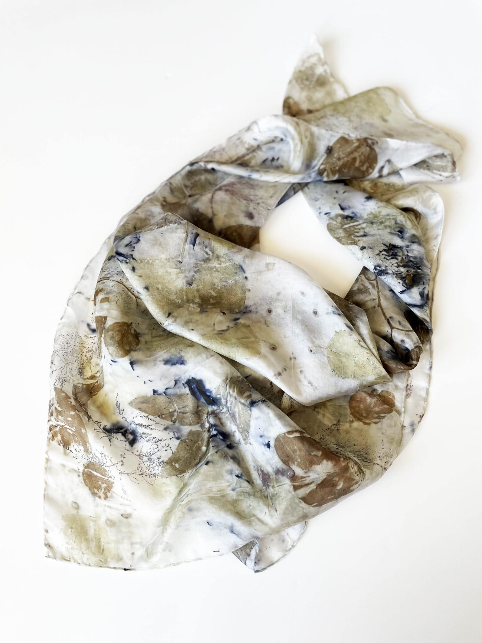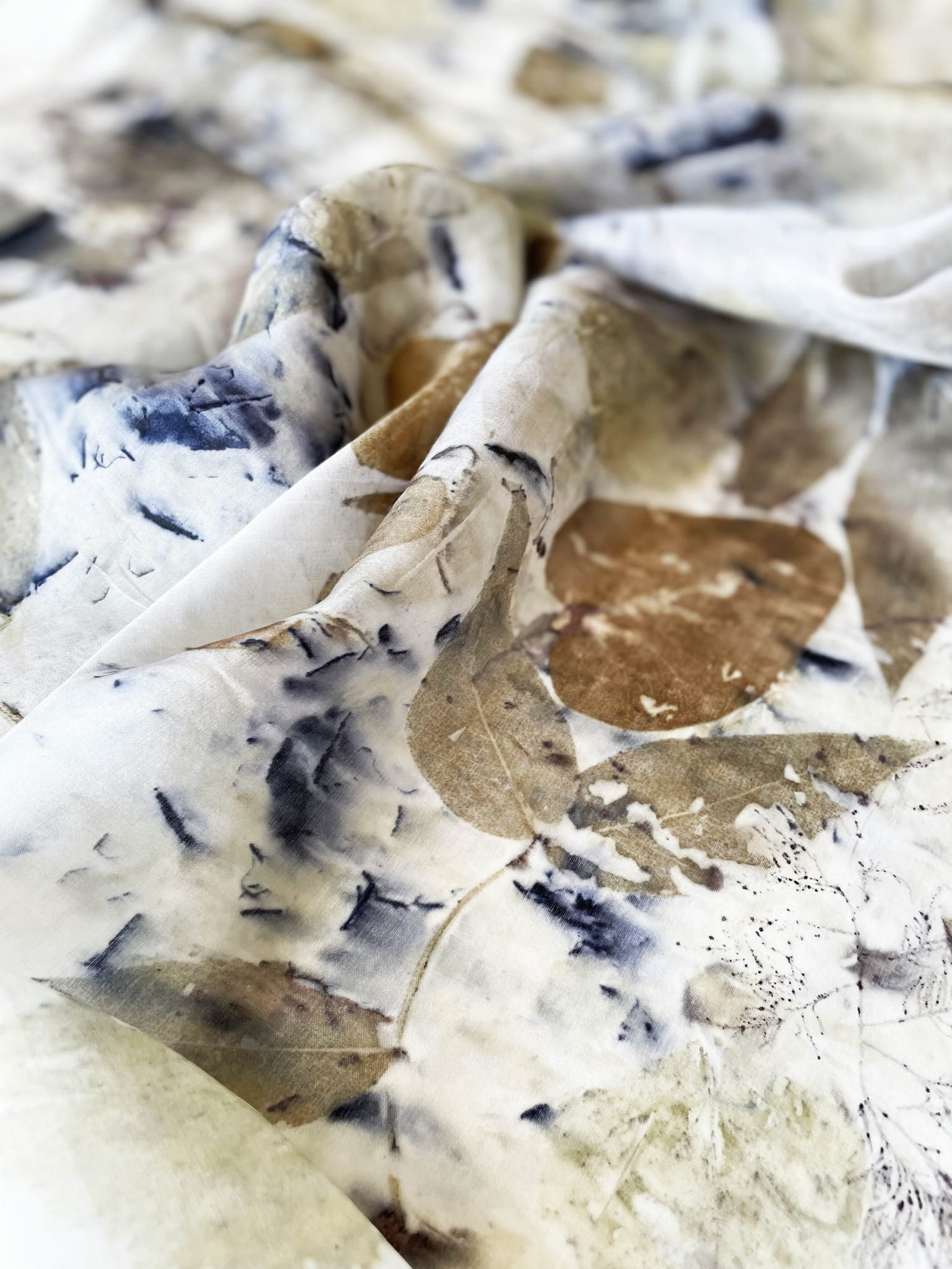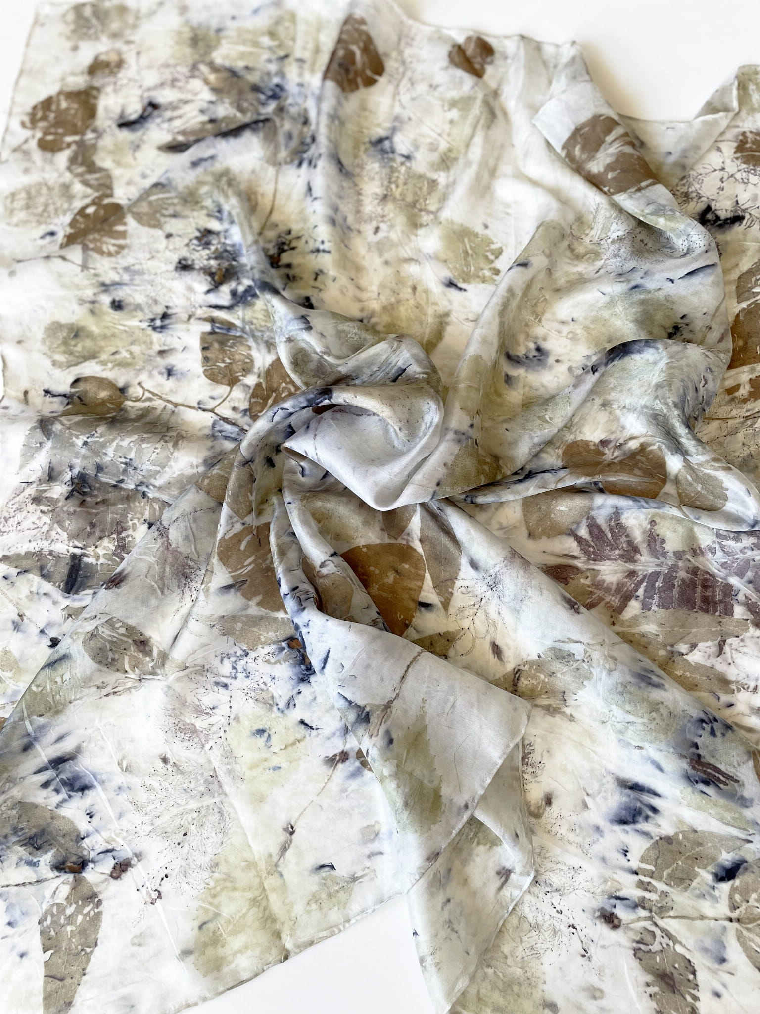 Wyjątkowa i niepowtarzalna chusta wykonana techniką eco-printu - czyli barwienia tkaniny samymi roślinami. Eco-print to technika, która polega na odbitce dosłownie natury. W jedwabną chustę zawijam różnego rodzaju rośliny i to one tworzą potem ten niepowtarzalny wzór. Tu do powstania tej chusty użyłam różnych gatunków liści i kwiatów co dało granatowe i niebieskie plamki. Chusta ma niezwykłą delikatność, dzięki parowaniu go. Uszyta jest ze 100% białego jedwabiu ( ponge 5) a jej brzeg jest obszyty ręcznie. Kolory to wszelakie odcienie beżu, zieleni, brązu. Na chuście widać wyraźnie odbitki liści eukalitusa, brzozy, tamaryszku.