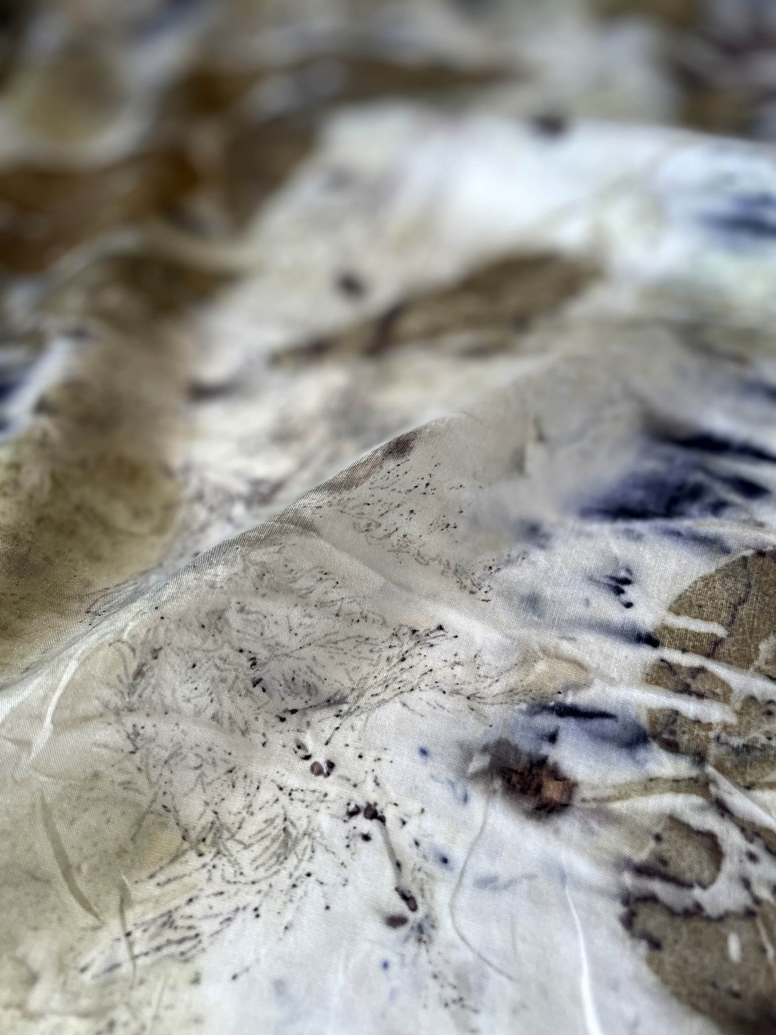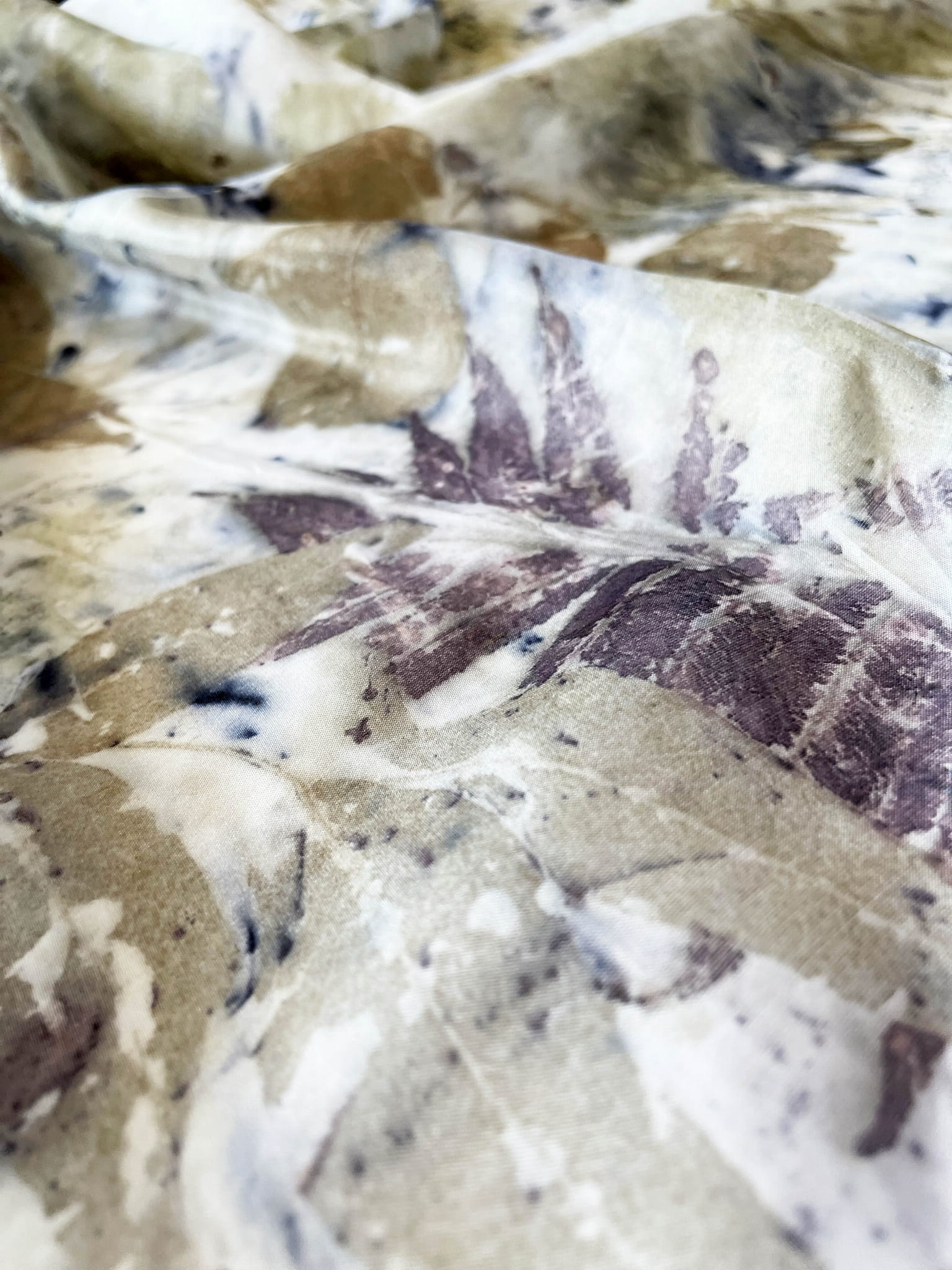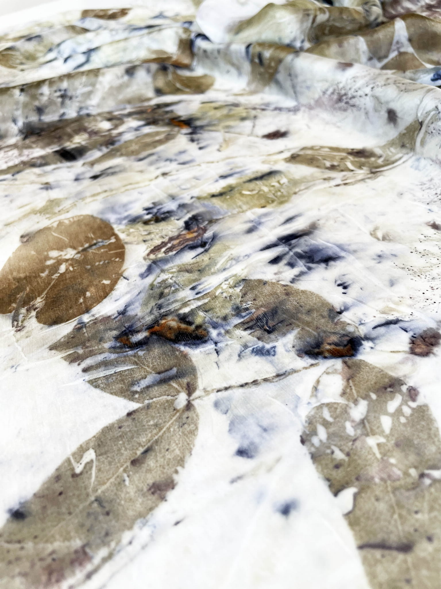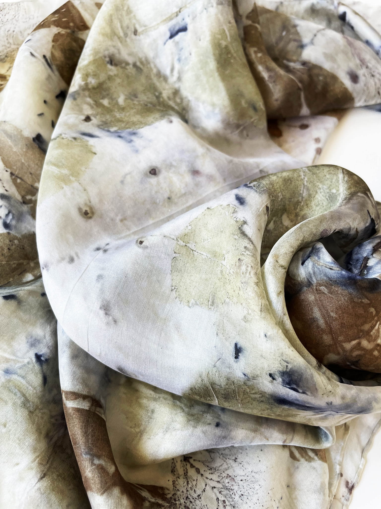 Wyjątkowa i niepowtarzalna chusta wykonana techniką eco-printu - czyli barwienia tkaniny samymi roślinami. Eco-print to technika, która polega na odbitce dosłownie natury. W jedwabną chustę zawijam różnego rodzaju rośliny i to one tworzą potem ten niepowtarzalny wzór. Tu do powstania tej chusty użyłam różnych gatunków liści i kwiatów co dało granatowe i niebieskie plamki. Chusta ma niezwykłą delikatność, dzięki parowaniu go. Uszyta jest ze 100% białego jedwabiu ( ponge 5) a jej brzeg jest obszyty ręcznie. Kolory to wszelakie odcienie beżu, zieleni, brązu. Na chuście widać wyraźnie odbitki liści eukalitusa, brzozy, tamaryszku.