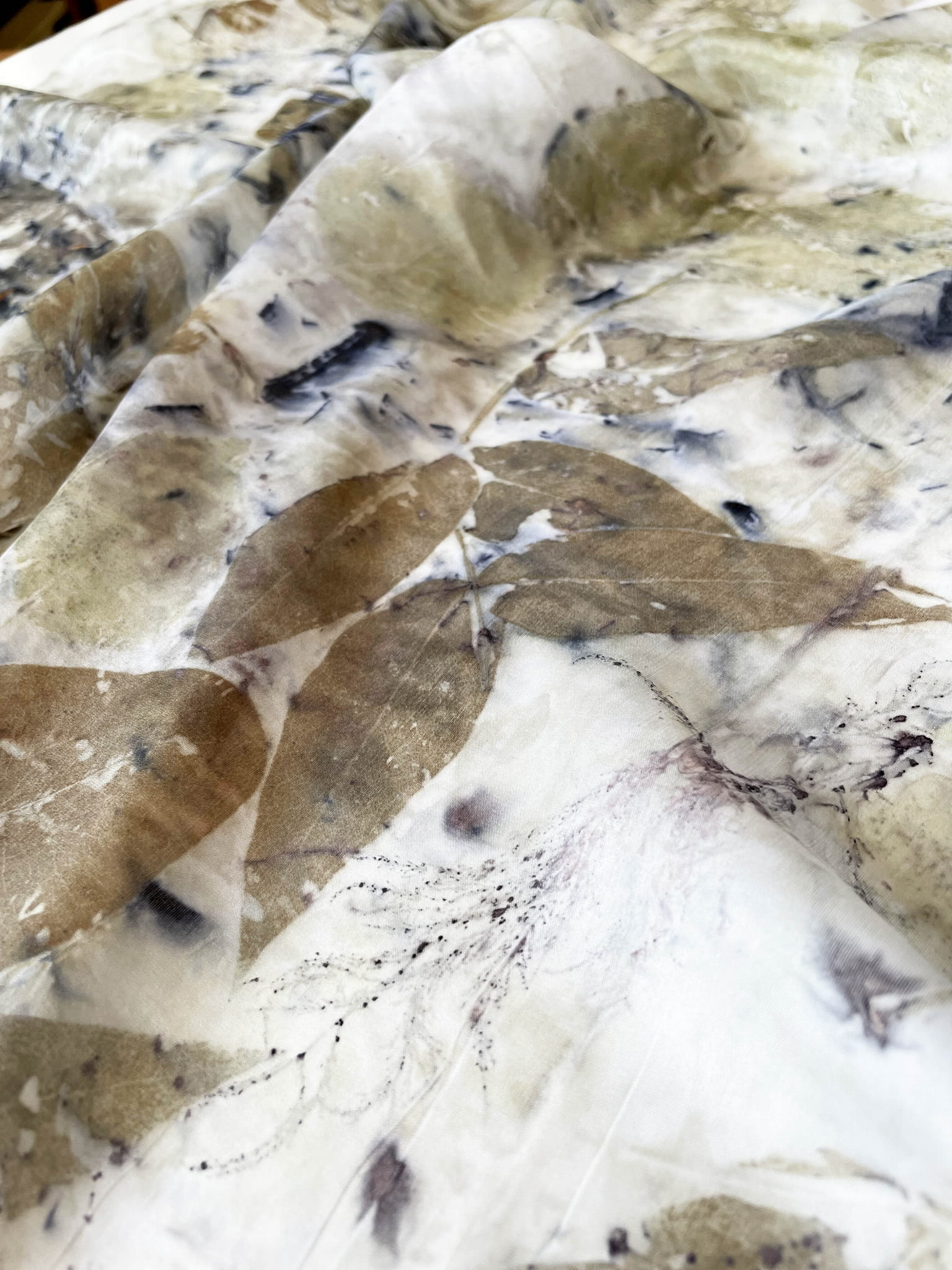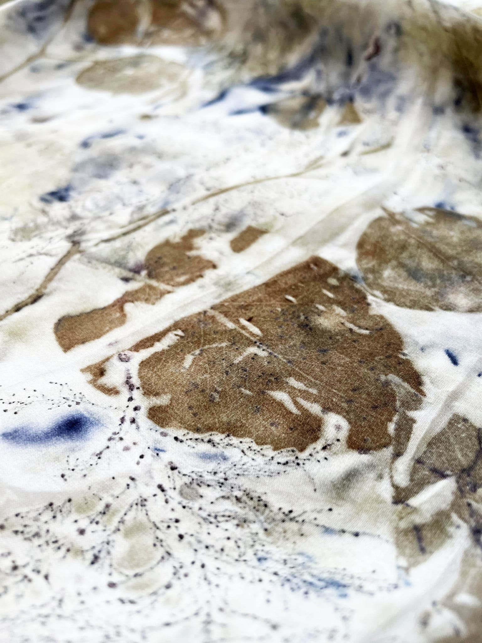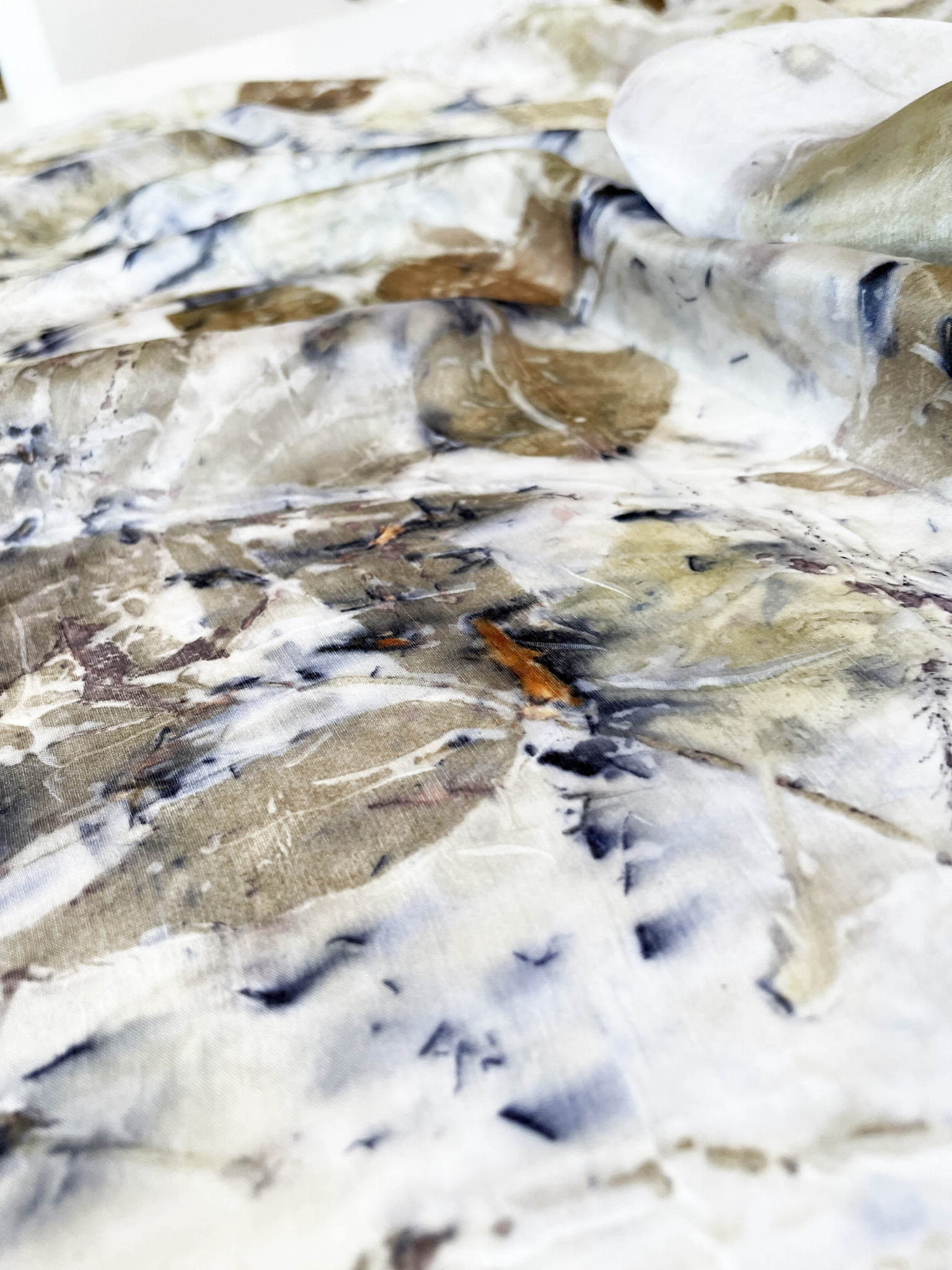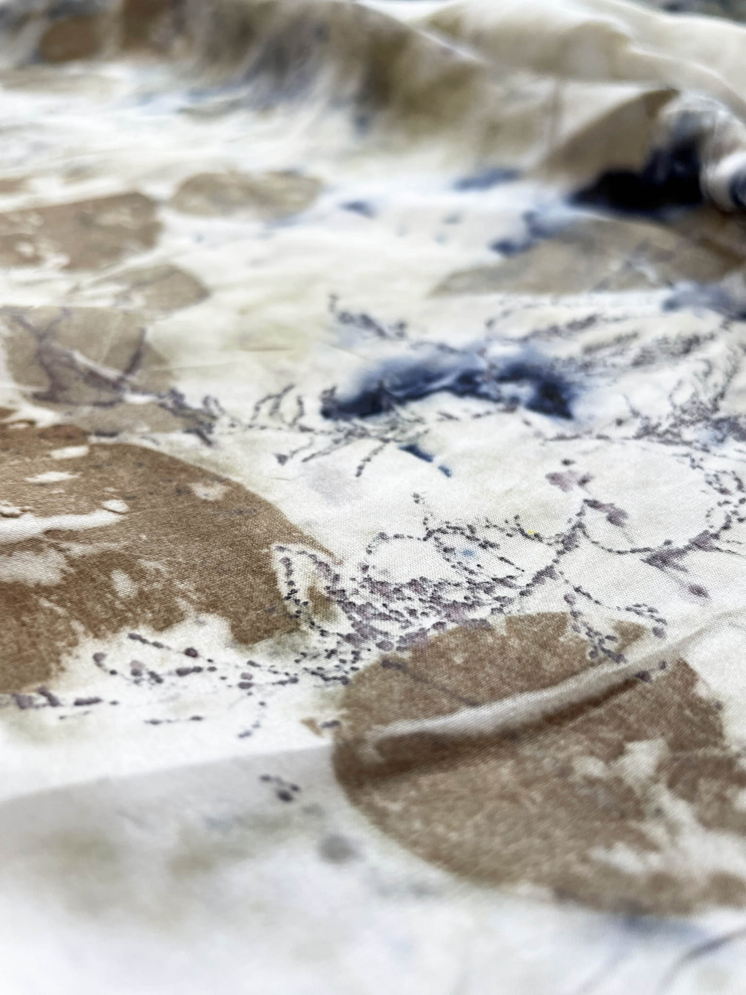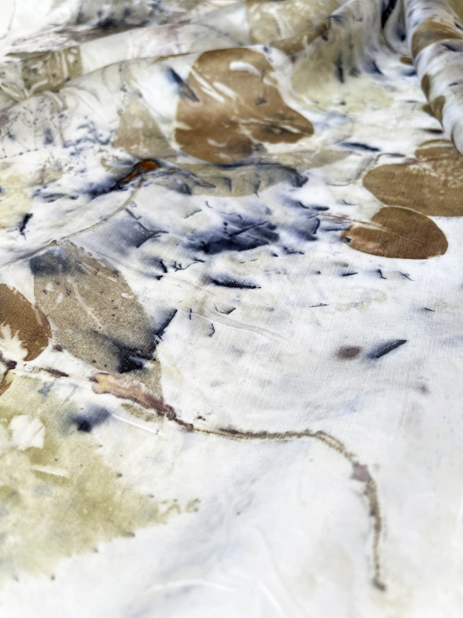 Wyjątkowa i niepowtarzalna chusta wykonana techniką eco-printu - czyli barwienia tkaniny samymi roślinami. Eco-print to technika, która polega na odbitce dosłownie natury. W jedwabną chustę zawijam różnego rodzaju rośliny i to one tworzą potem ten niepowtarzalny wzór. Tu do powstania tej chusty użyłam różnych gatunków liści i kwiatów co dało granatowe i niebieskie plamki. Chusta ma niezwykłą delikatność, dzięki parowaniu go. Uszyta jest ze 100% białego jedwabiu ( ponge 5) a jej brzeg jest obszyty ręcznie. Kolory to wszelakie odcienie beżu, zieleni, brązu. Na chuście widać wyraźnie odbitki liści eukalitusa, brzozy, tamaryszku.